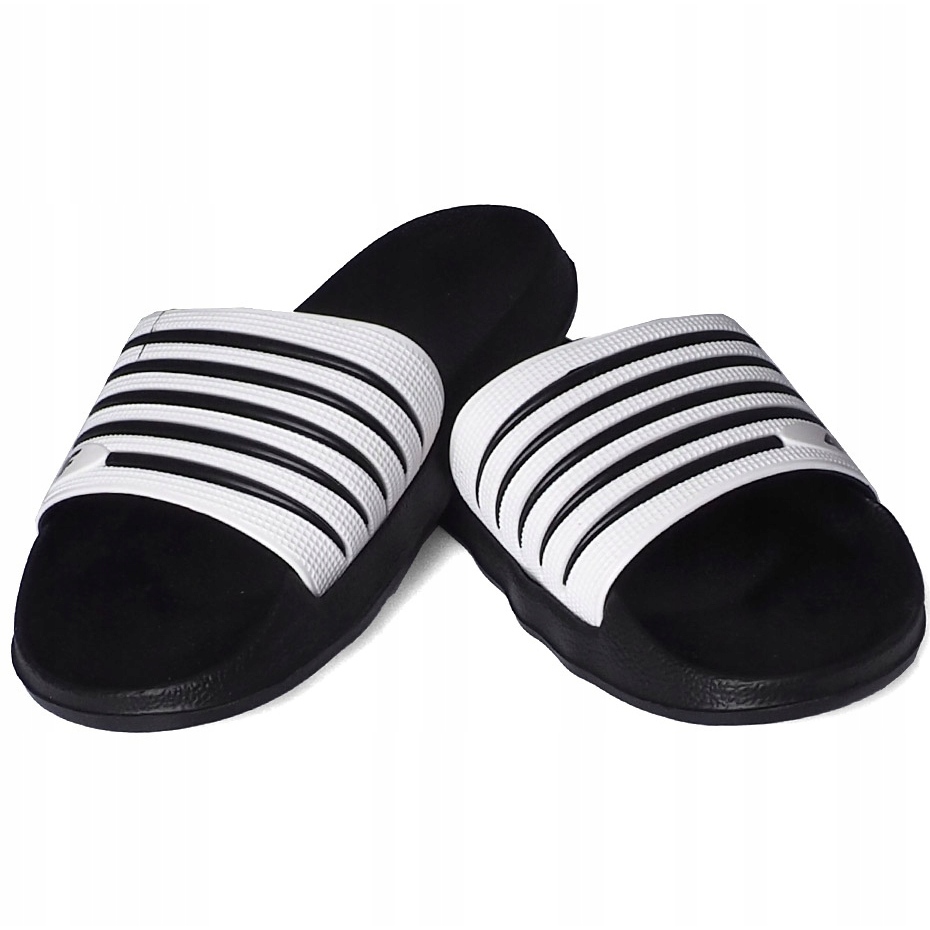 Klasické, pohodlné ženské pantofle 4F, ideální pro léto - na procházku, přes bazén nebo na pláž. Jednoduchý, funkční střih s kontrastními pruhy v černobílých odpovídá mnoha letním stylizacím.