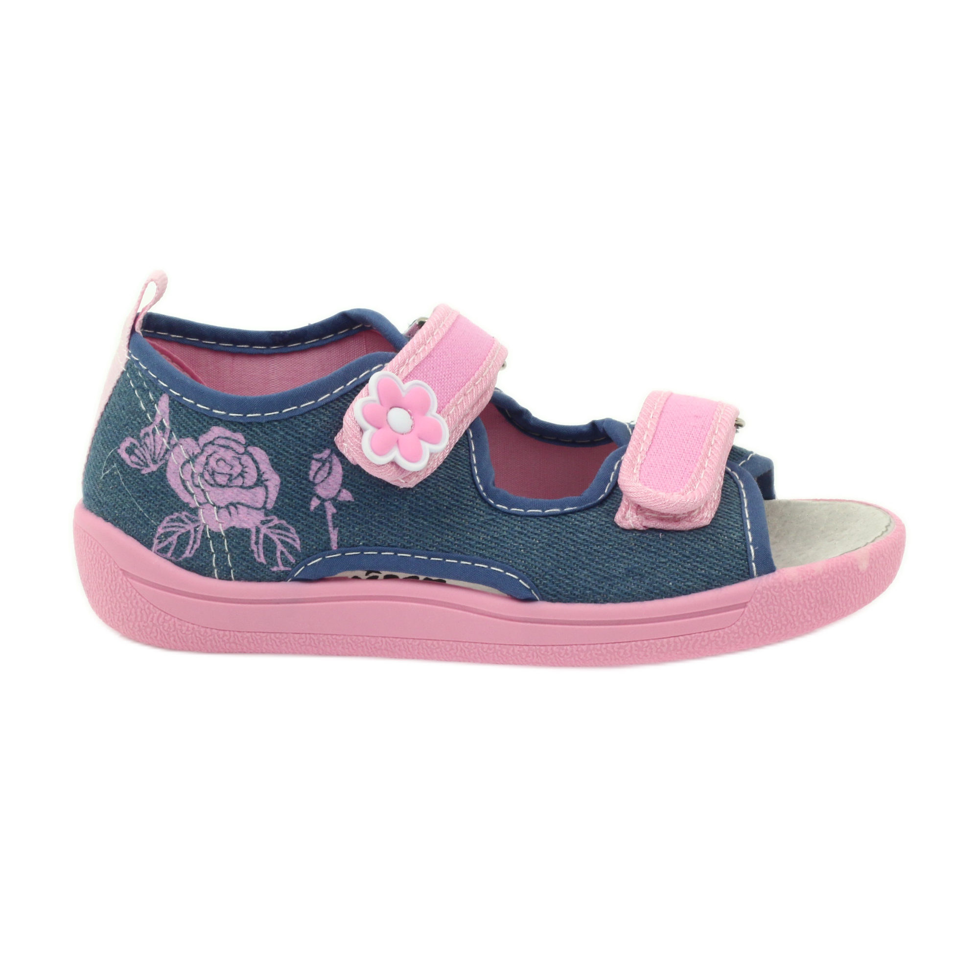 Nabízíme stylové dětské sandály American Club, model wz.404/2018, které potěší kombinací modrých džínů a růžových akcentů. Tyto rozkošné pantofle pro dívky byly navrženy s ohledem na pohodlí a styl těch nejmenších.