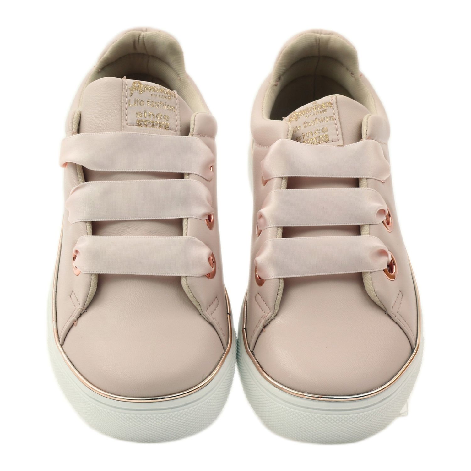 Jemné, dívčí tenisky American Club model 17152 v módní růžové barvě jsou spojením stylu a každodenního pohodlí. Svršek z kvalitní ekologické kůže působí elegantně a neobvyklá saténová stuha provlečená širokými očky dodává botám jemnou romantickou notu. Lemování kolem podrážky a o něco silnější bílá gumová podrážka (výška 1,5 cm) zdůrazňují městský, ležérní charakter obuvi.