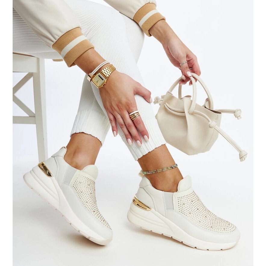 Beige tenisky na klínu se zirkony Ashleey jsou perfektní volbou pro ženy, které chtějí kombinovat pohodlí s elegancí v jejich letních stylizacích. Tyto lehké boty, vyrobené z vysoce kvalitní ekologické kůže, jsou ideální pro každý den i pro zvláštní příležitosti.