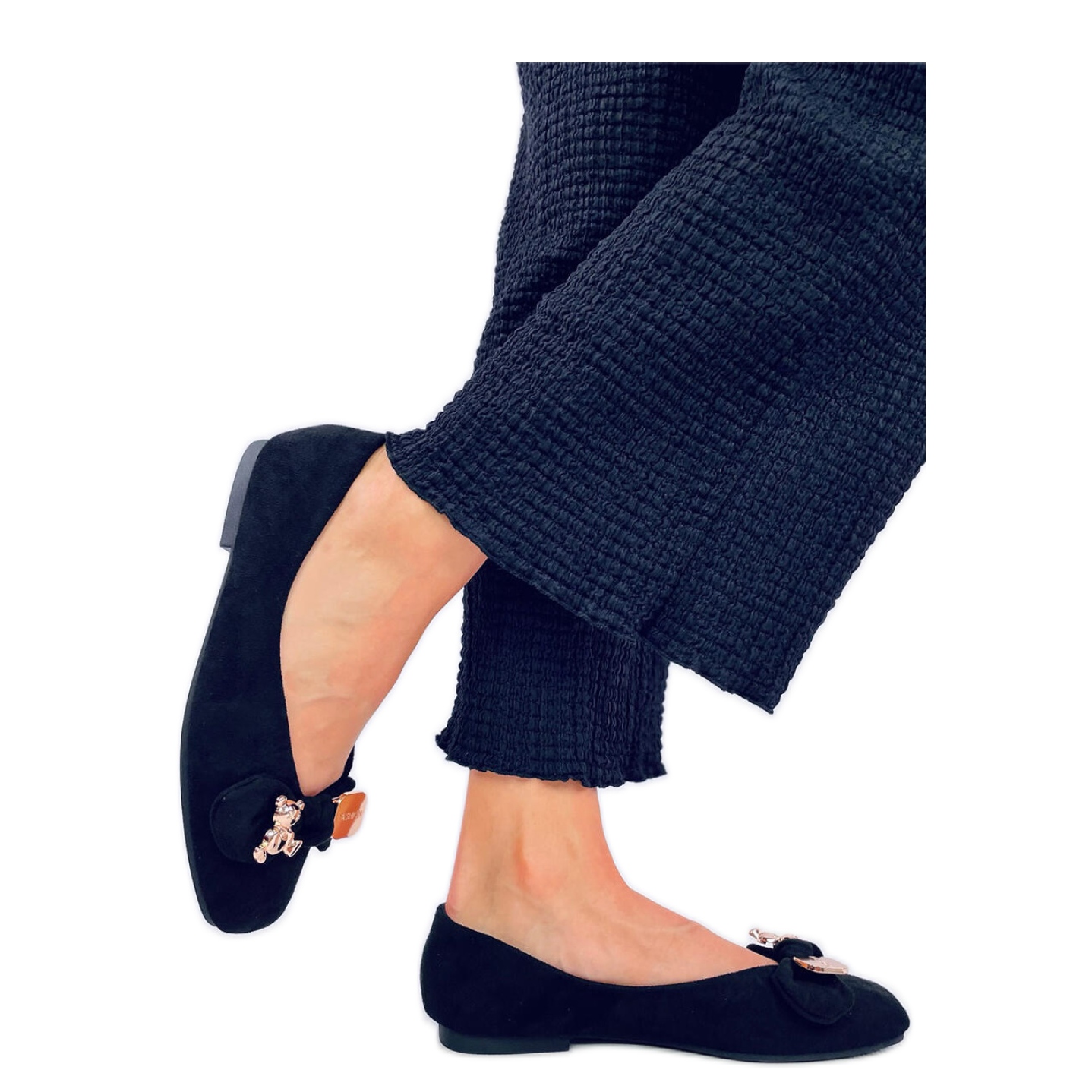 Černé baleríny je způsobují, že se hodí k mnoha stylům - od každodenního po elegantnější. Úhledný řez s čtvercovými nástroji jim dává originalitu a okouzlující luk se zlatým bezpečnostním špendlíkem a medvíjem upouští oko, což dává botám jedinečný charakter.