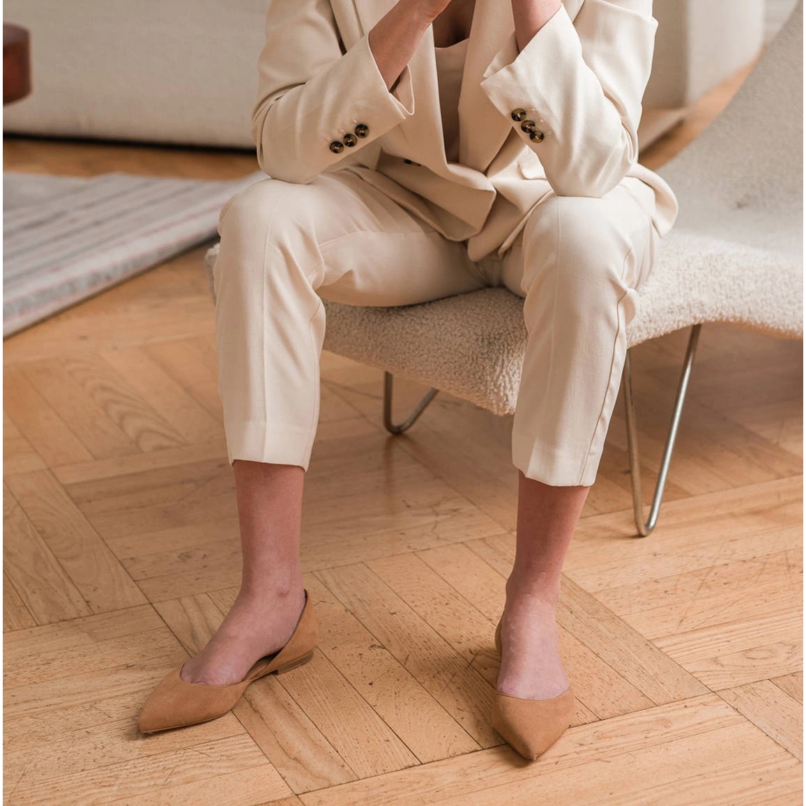 Balerínky se vyznačují špičatou špičkou, která jim dodává šik vzhled a skvěle se hodí k ležérním i elegantnějším stylům. Jsou vyrobeny z vysoce kvalitní přírodní semišové kůže a nabízejí pohodlí a odolnost a také elegantní vzhled.