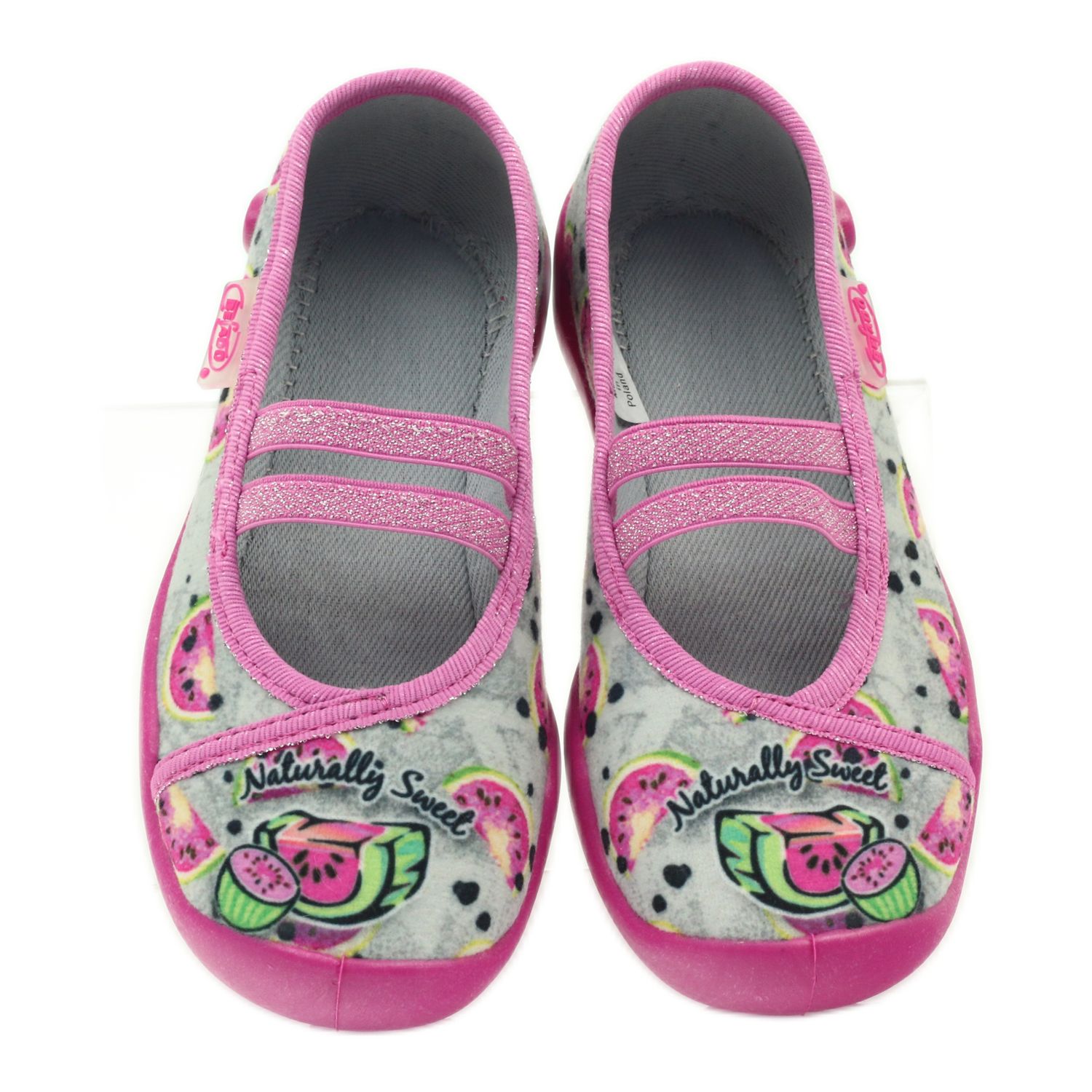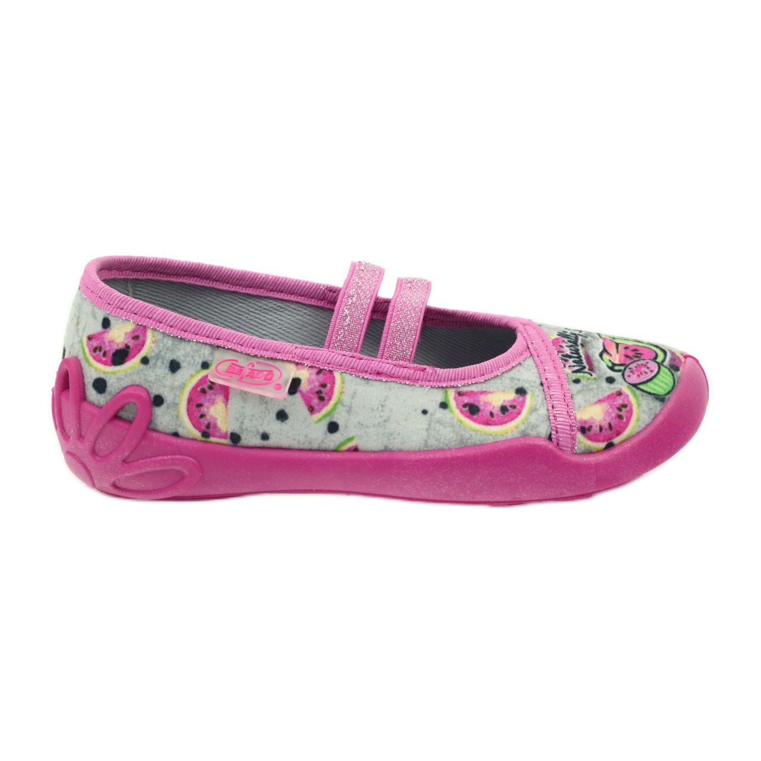Tyto balerínky se vyznačují ortopedicky správnou podrážkou s mírně zvýšenými bočnicemi a vyšším podpatkem, který navíc podporuje nožičky malých holčiček v jejich každodenních dobrodružstvích. Květinový vzor s vodními melouny na šedém podkladu jim dodává kouzlo a dvě ozdobné gumičky v horní části dělají pantofle ještě působivější.