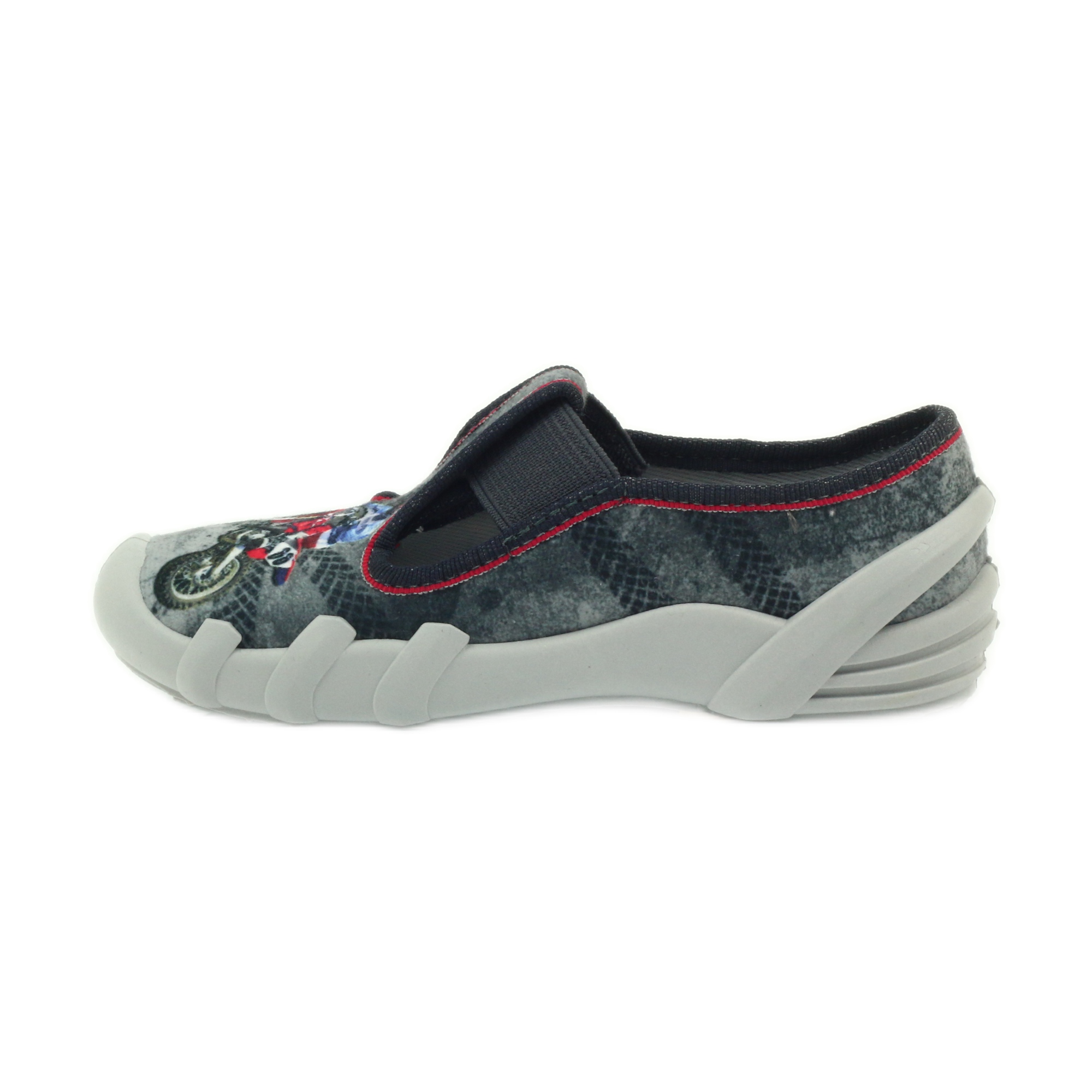 Dětské pantofle Befado 290X166 jsou perfektní volbou pro malé průzkumníky, kteří oceňují pohodlí a styl. Tyto jedinečné šedé tenisky s červenými akcenty a nášivkou na motorce na přední straně způsobí, že se každý malý kluk bude cítit jako skutečný šampion ve hře.