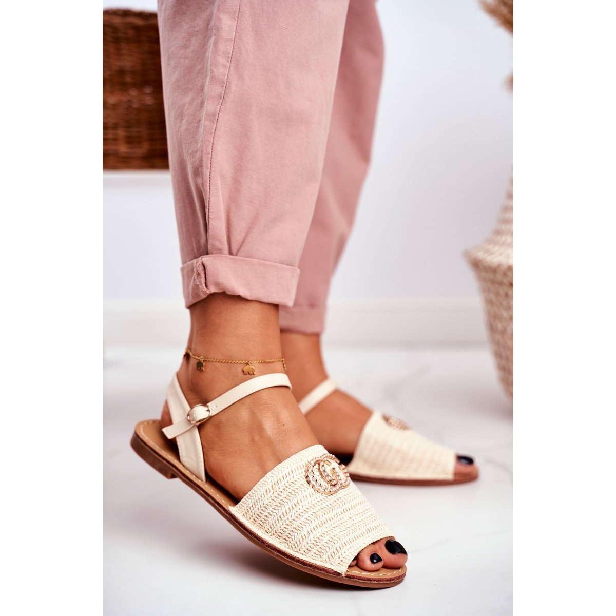 Béžové dámské ploché sandály Lu Boo Felicia jsou perfektní volbou pro letní dny! Tyto elegantní sandály zdobené zlatými prvky a bílými perlami budou dokonalým doplňkem každého stylingu. Jejich klasický střih a módní pletený materiál z nich dělá nejen stylové, ale také extrémně pohodlné.
