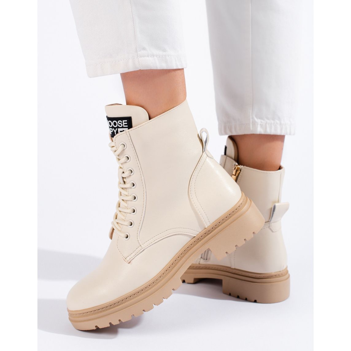 Pohodlné přizpůsobení zajišťuje zip a šněrování - každý uživatel si boty přizpůsobí svým potřebám. Plná špička a vestavěná a vyztužená pata zajišťují pohodlí a bezpečí nohou při používání, plochý 4,5 cm vysoký podpatek je řešením, které bude optimálním kompromisem mezi estetikou a pohodlím.