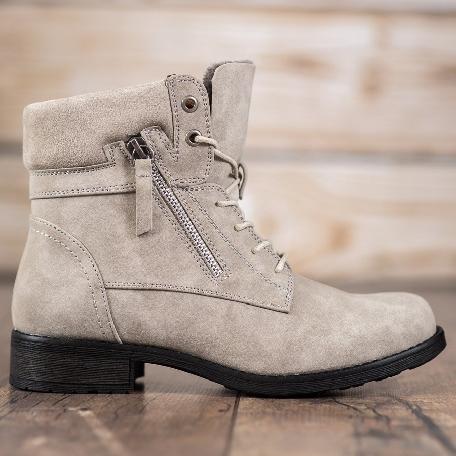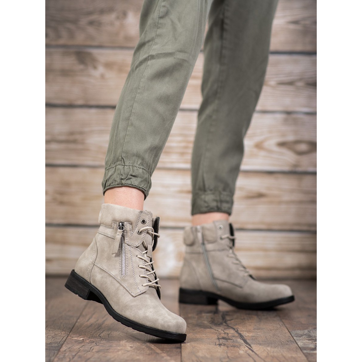 Kozačky se vyznačují kulatou špičkou a originálním ozdobným zipem, který jim dodává jedinečný charakter. Zapínání na tkaničky a zip umožňuje snadné nazouvání a přesné přizpůsobení každé noze. Horní výška 13 cm dokonale obepíná kotník a plochý podpatek (3 cm) zajišťuje stabilitu a pohodlí po celý den.