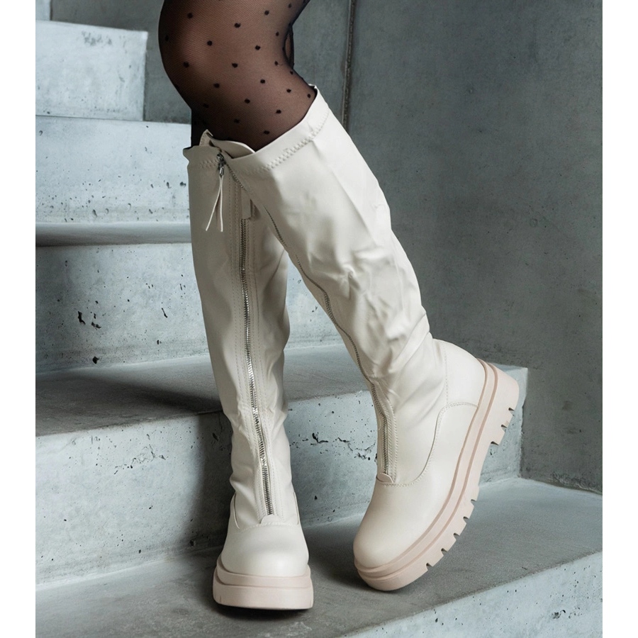 Inna marka Béžové kozačky z ekokůže na plochém podpatku zdobené zipem béžový