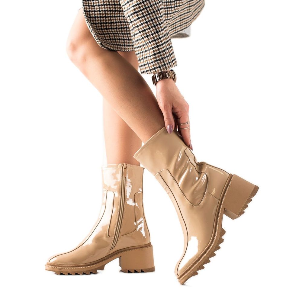 Béžová a hnědá barva kozaček je činí mimořádně univerzálními a snadno kombinovatelné s různými styly – od ležérních až po elegantnější. Boty vyrobené z vysoce kvalitní ekologické kůže nejen efektně vypadají, ale jsou také ekologické. Lakovaný povrch jim dodává jedinečný lesk, díky čemuž jsou skvělou volbou pro večerní výlety.