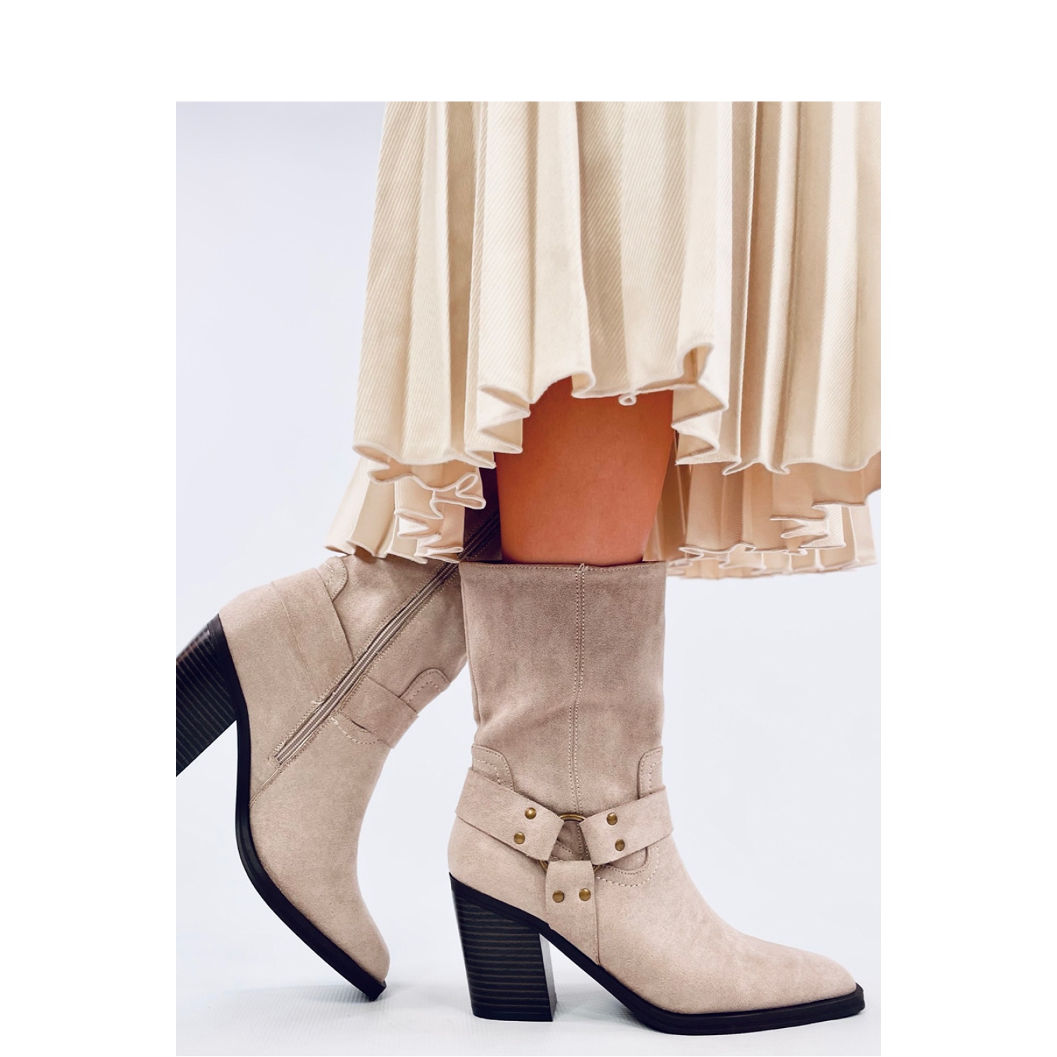 Objevte mimořádný styl a pohodlí v béžových semišových kovbojských botách! Tento módní model, vytvořený z ekologického semiše, určitě přitáhne oči díky neobvyklému řezu čtvercovými prsty. Vysoký svršek přidává charakter a upevnění zipu na boku horní části je rychlé a pohodlné odstranění a odstranění bot.