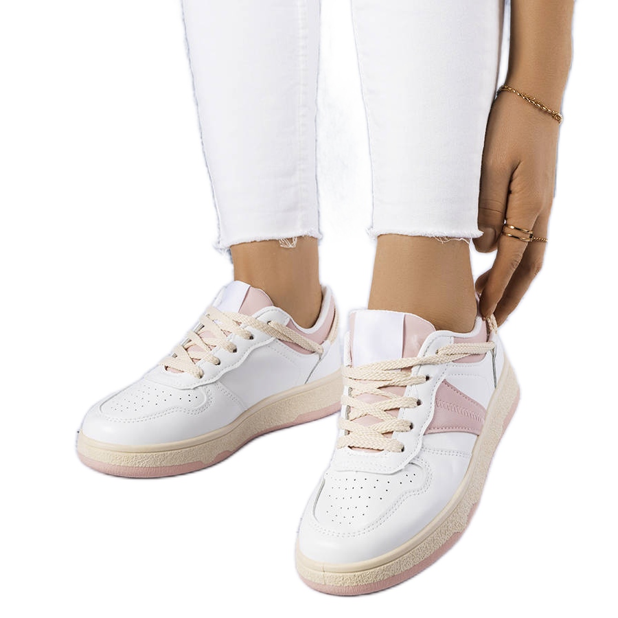 Moderní tenisky inspirované módou z 90. let a kombinující klasickou bílou se sladkými růžovými vložkami. Model se vyznačuje perforovaným kulatým nosem, barevným běhounem a tkaničkami v tónu tónovaném na detaily. Ideální pro příležitostné stylizace - budou pracovat každý den na procházku nebo setkání s přáteli.