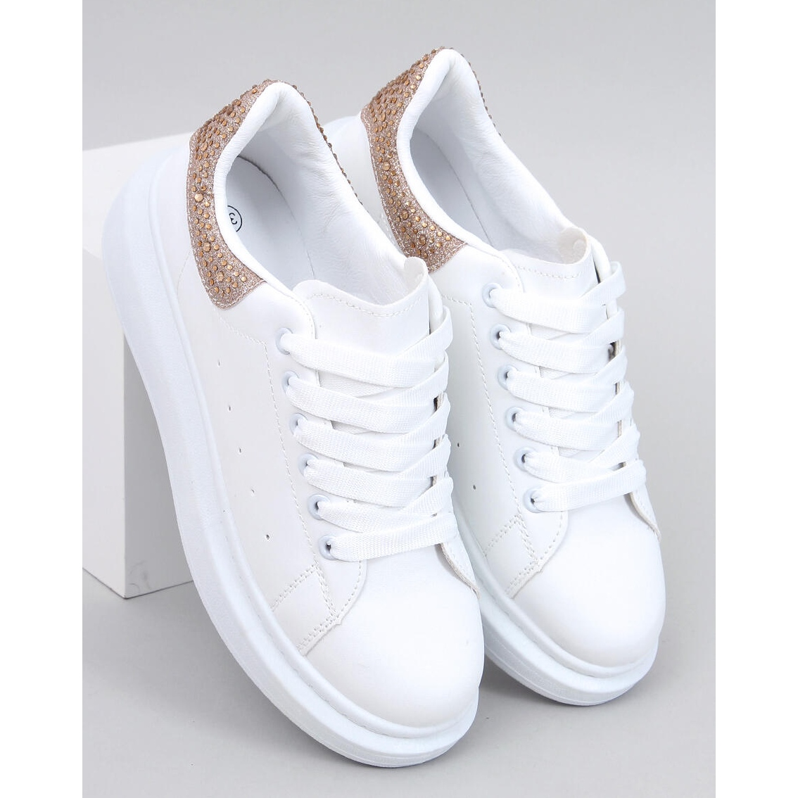 Objevte bezkonkurenční pohodlí a styl s našimi bílými a zlatými tenisky na platformě! Tyto ženské sportovní boty kombinují klasický střih s moderními akcenty, které jistě upoutají oko. Díky třpytky vloženému zirkony se stávají perfektní volbou pro každou příležitost, a to jak denně, tak pro výjimečné výstupy.