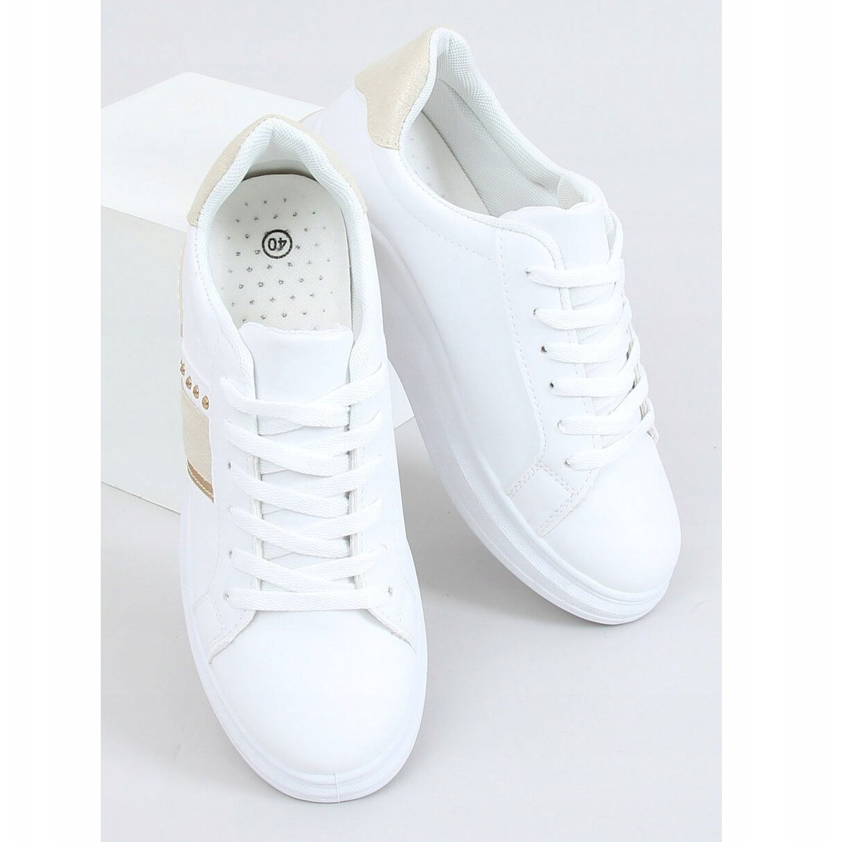 Tyto tenisky jsou vyrobeny z ekokůže a jsou pohodlné na celodenní nošení. Díky látkovému vnitřku se vaše nohy budou cítit pohodlně a 2 cm vysoká rovná podrážka zaručí stabilitu a pohodlí při každém kroku. Díky kombinaci béžové a bílé barvy se perfektně hodí k různým stylům, jak pro každodenní použití, tak pro zvláštní příležitosti.