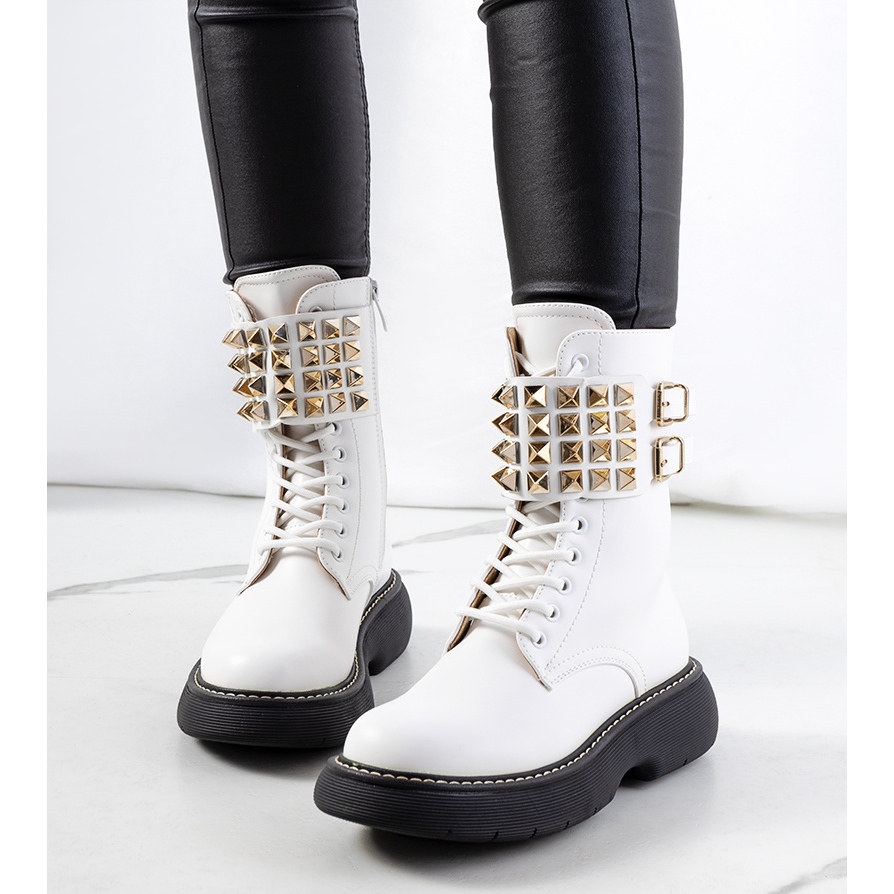Bílé kozačky s cvočky Lacer nejsou jen obuví, ale skutečným vyjádřením stylu, který dodá jedinečný charakter každému stylingu. Jejich svršek je ozvláštněn originálním páskem zdobeným zlatými cvočky, díky čemuž vypadají efektně a módně. Boty jsou vyrobeny z vysoce kvalitní ekologické kůže a zajišťují komfort nošení po celý den.