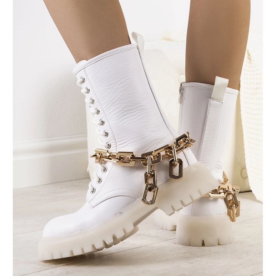 Bílé boty Curiti s odnímatelným zlatým řetězem - stylový, pohodlný a univerzální. Ideální pro podzimní/zimní sezónu, budou dokonale doplňovat příležitostné i elegantnější oblečení - nosit je kabátem, koženou bundou, džíny nebo šaty. V horní části vysoce kvalitní ekologické kůže je interiér zakončen tenkou, jemně oteplovací látkou, která zajišťuje pohodlí v chladnějších dnech. Silný zlatý řetězec lze snadno odstranit, aby se změnila povaha bot - z statečného přízvuku na utlumenou klasiku.
