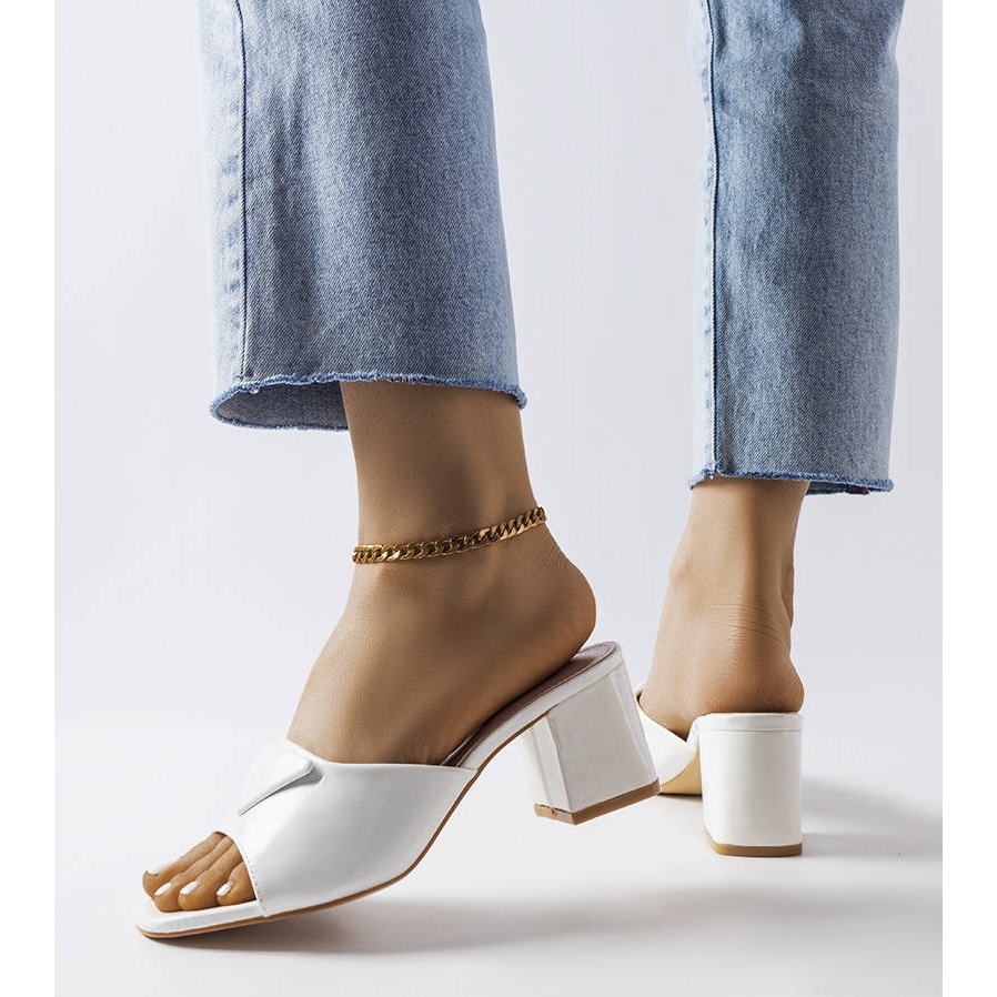 Seznamte se s bílým patentem Branch mules na vysokém podpatku - must have každé módní ženy, která hledá eleganci a pohodlí pro letní dny. Tyto stylové žabky jsou kombinací moderního designu a funkčnosti. Vyrobeny z ekologické kůže, pokryté poutavým lakem, upoutají pozornost a dodají svěžest každému stylingu.