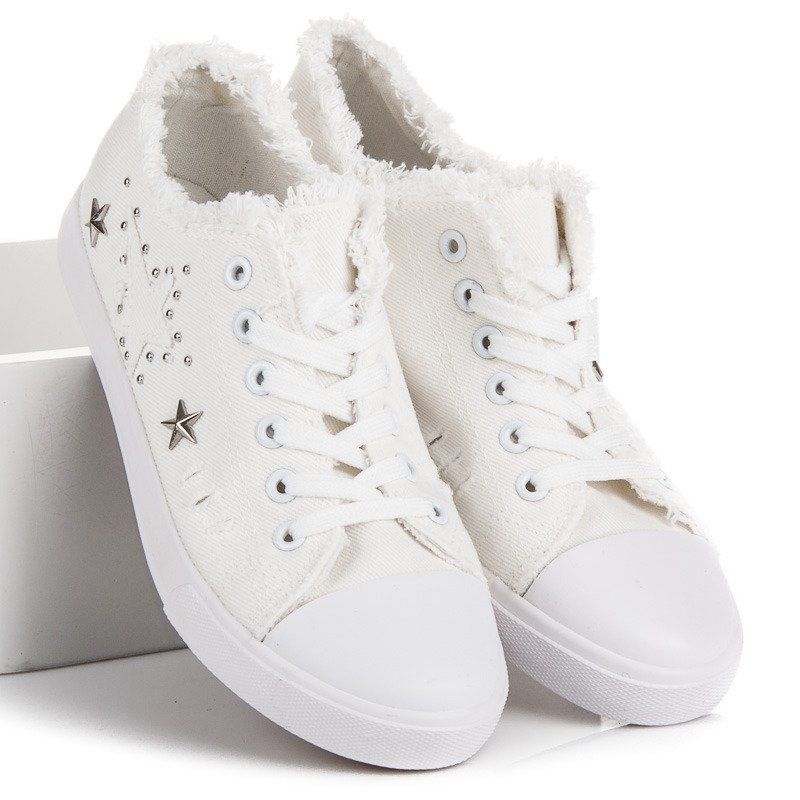Objevte jemnou eleganci v bílých látkových teniskách, které budou dokonalým doplňkem každého stylingu. Tyto jedinečné boty se vyznačují zasněženým odstínem a unikátní úpravou kolem kotníku, která jim dodává dívčí šarm. Ozdoby v podobě jemných teček a hvězdiček dávají vyniknout teniskám při zachování minimalistického stylu.