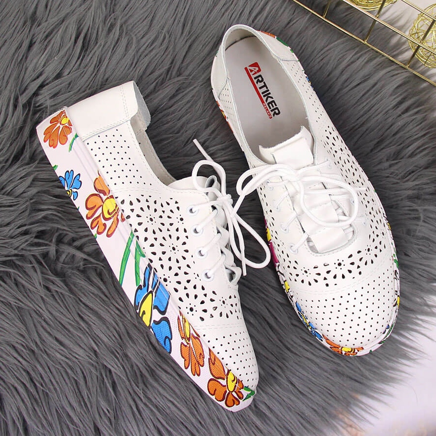 Bílé boty ARTIKER jsou perfektní volbou pro každodenní nošení, perfektně ladí k ležérním outfitům. Jejich módní květinový motiv dodává svěžest a zapínání na šněrování umožňuje individuální padnutí. Produkt je dostupný ve standardních velikostech, proto se vyplatí vybrat si velikost, kterou nosíme nejčastěji.