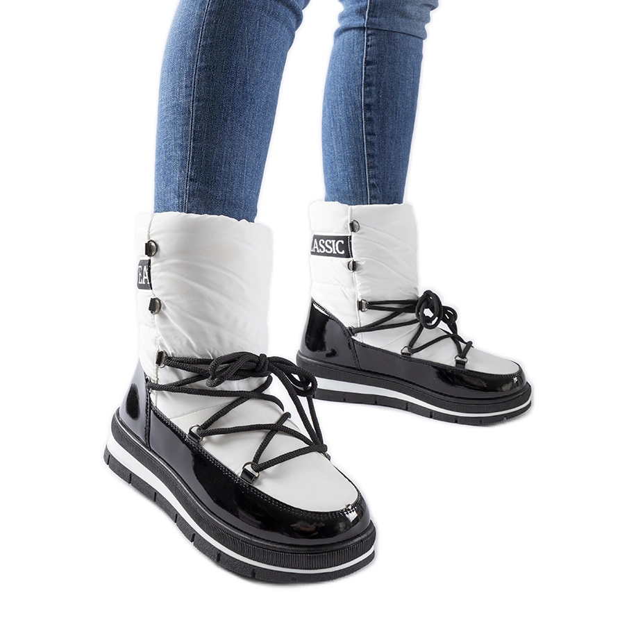 Tyto bílé sněhové boty, které jsou navrženy pro chladnější měsíce, budou perfektním doplňkem vašeho zimního šatníku, bez ohledu na to, zda se chystáte na procházku po městě nebo setkáte se s přáteli. Díky kožešině uvnitř bot a zajímavých barev - bílé s černými akcenty - přitahují vzhled a přidají charakter jakékoli stylizace.