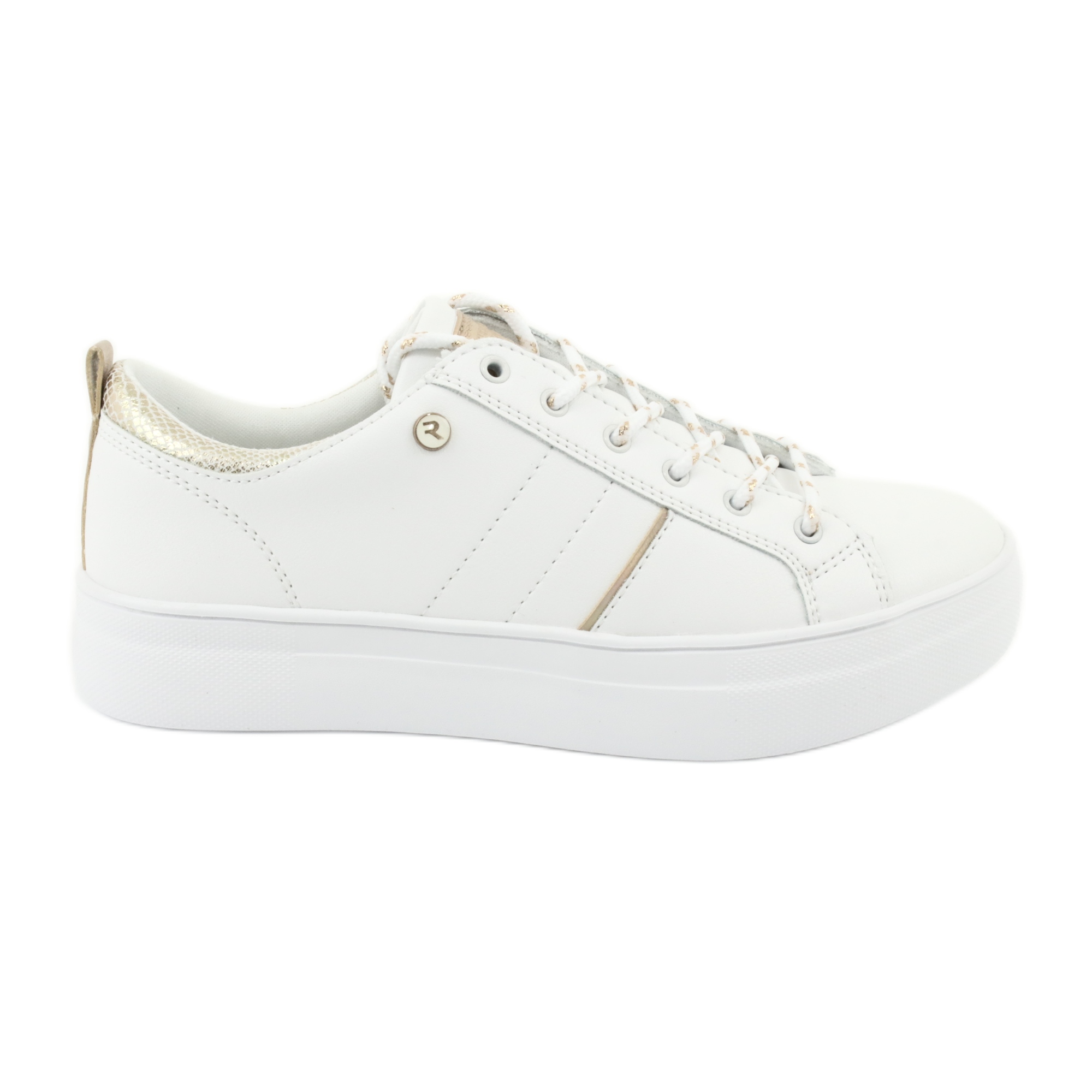 Moderní ženské tenisky vyrobené z vysoce kvalitní ekologické kůže, která kombinuje sportovní postavu s módními detaily. Model RH09 se vyznačuje elegantními zlatými vložkami a jemnými žlutými akcenty a interiér je lemován měkkou látkou pro pohodlí při nošení. Boty jsou zabudovány na mírně silnější, bílé, velmi lehké a flexibilní podešev, což zajišťuje dobré odpružení a pohodlí každý den.