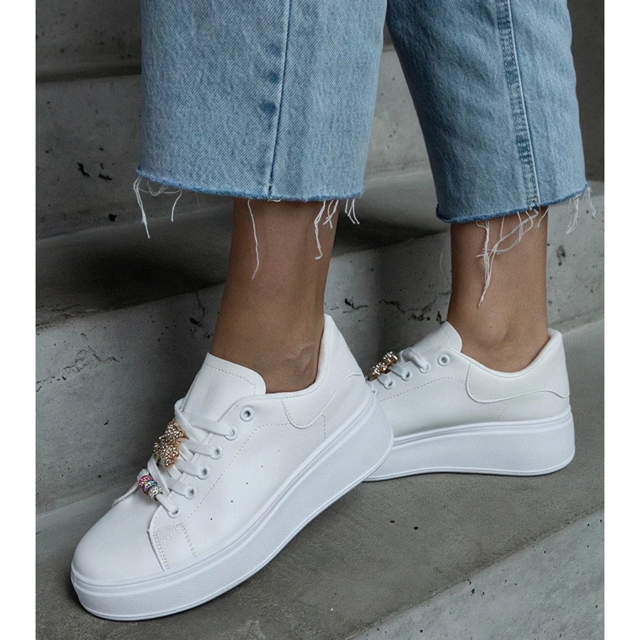 Tyto tenisky vynikají nejen s klasickou bílou barvou, ale také účinným, silným dekorativním řetězcem, který se stal absolutním hitem sezóny. Díky tomuto detailu přidávají tenisky charakter jakékoli stylizace, ať už denně nebo při formálnějších příležitostech.