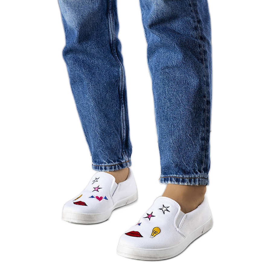 Tenisky z bílého materiálu s náplasti Anais - stylová, pohodlná a lehká obuv, každý den perfektní. Klasický svršek s nízkým textilem byl zdoben barevnými výšivkami a flexibilní vložky nahoře zlepšují přizpůsobení a usnadňují instalaci (posuvná spona). Gumová podešev s malou platformou (přibližně 2 cm) zajišťuje stabilitu a látka vložte pohodlí.