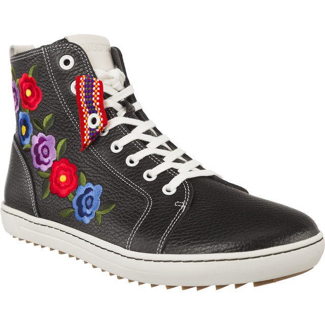 Hledáte boty, které kombinují klasický vzhled s pohodlím Birkenstock? Model Bartlett jsou vysoké, šněrovací kozačky z přírodní pevné kůže v elegantní černé barvě. Decentní květinová výšivka na boku svršku dodává ženský charakter a kontrastní bílá podrážka a tkaničky podtrhují moderní styl.