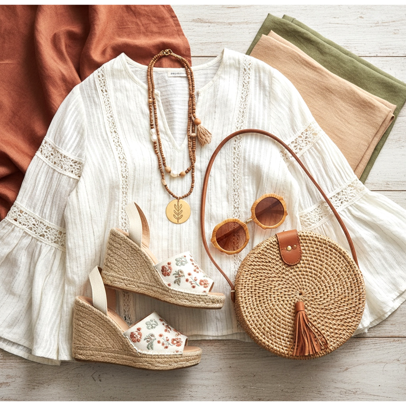 Co se týče materiálů, boho 2026 dominuje len, bavlna, hedvábí, přírodní ovčí kůže, přírodní nebo vysoce kvalitní ekologická kůže, ale i juta a ratan. Jedná se o materiály, které vypadají vznešeně, jsou pohodlné a odpovídají ekologickým hodnotám tohoto stylu.