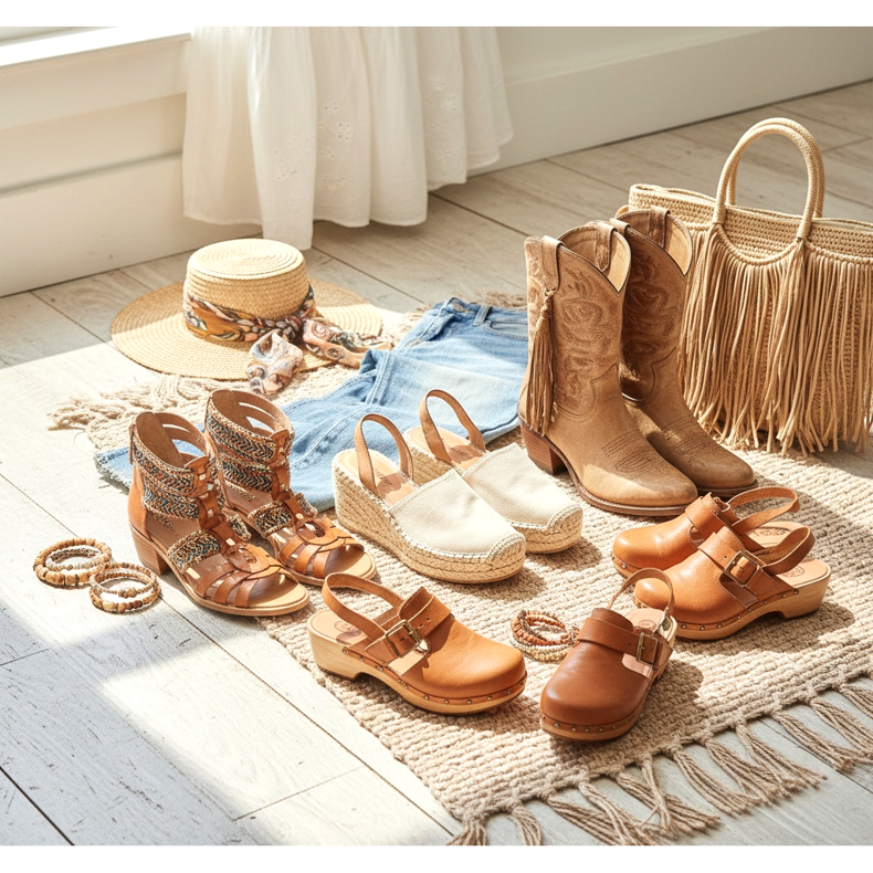 Dřeváky a muly vyrobené z přírodních materiálů: Dřeváky s dřevěnou podrážkou nebo muly z přírodní kůže v tónech karamelu a béžové jsou dalším klíčovým prvkem boho šatníku. Tato kombinace vytváří charakteristický boho efekt bez přílišné námahy.
