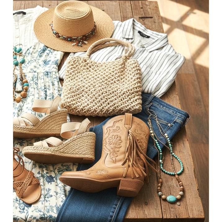 Kovbojské boty a boty inspirované westernem: Boty se západním zdobením – reliéfními vzory, třásněmi nebo delšími svršky – jsou v boho interpretaci extrémně módní. Nosí se k maxi šatům, rozevlátým džínům a širokým sukním.