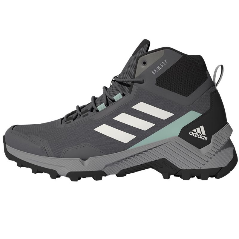 Adidas Eastrail 2 R.RDY GY4177 Shoty - Šedé ženské trekkingové boty kombinující sportovní design s funkčností. Model s vyšším řezem a klasickým šněrováním zajišťuje stabilní držení nohy na stezce a v městské oblasti a estetiku, tlumený šedý povrch s viditelným logem výrobce zdůrazňuje sportovní charakter.