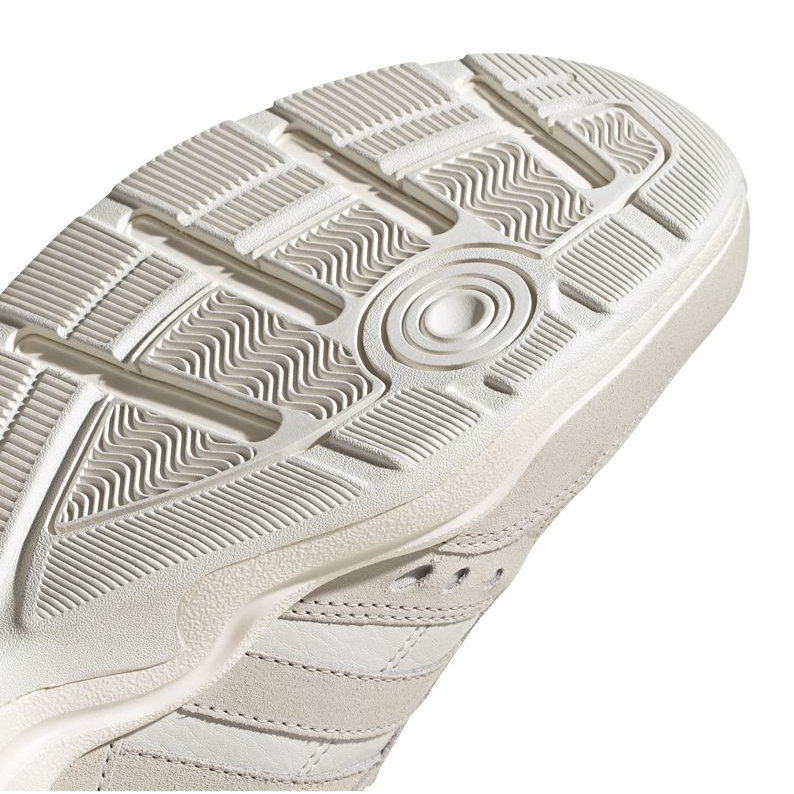 Bílo-béžový svršek je vyroben z kombinace syntetického materiálu a vysoce kvalitní kůže, což se promítá do odolnosti a stylu produktu. Poznávacím znamením tohoto modelu je charakteristické logo adidas - tři pruhy, které jsou nejen ozdobným prvkem, ale také naznačují autenticitu.