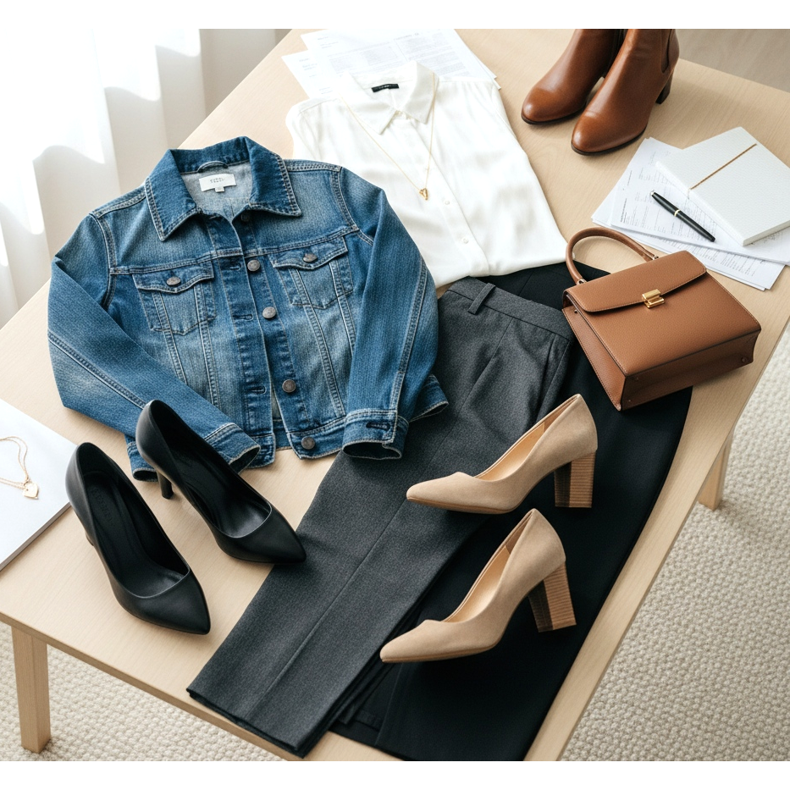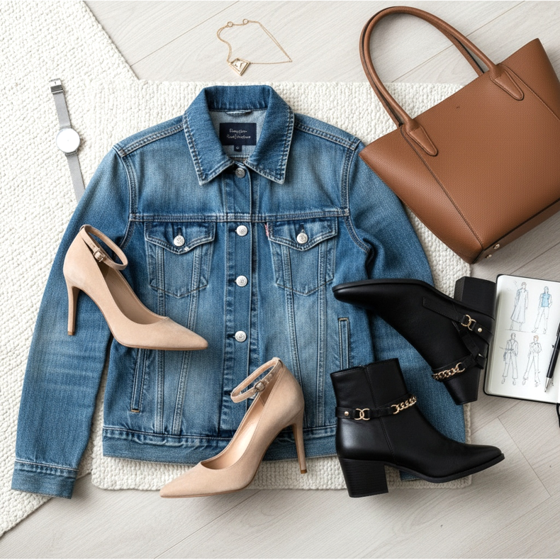 Elegantní boty s džínovou bundou do kanceláře