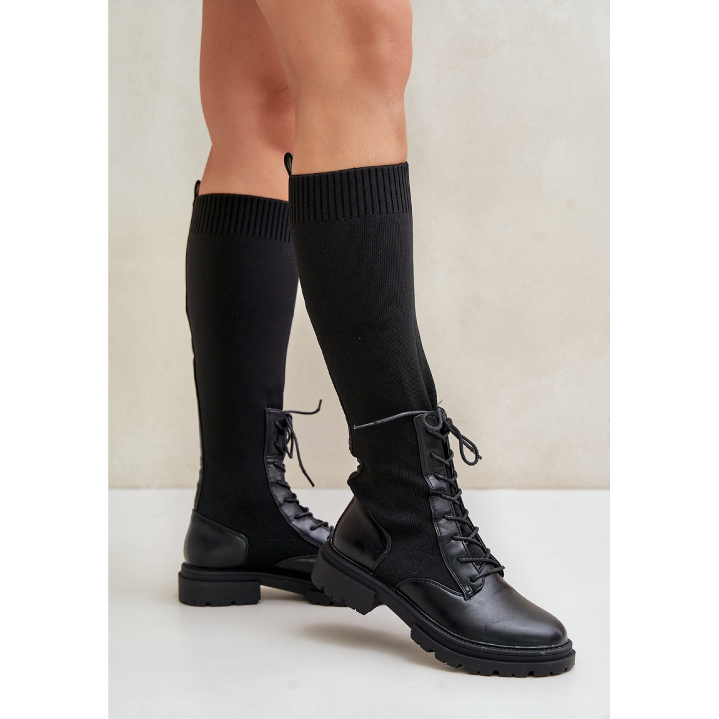 Boty mají výšku horní části 40 cm a plochý patu s výškou 3,5 cm, což z nich činí elegantní i praktické. Jsou k dispozici v klasické černé barvě, která vám umožní snadno je kombinovat s různými oděvy. Upevnění ve formě šněrování a vkládání možností jim dává všestrannost.