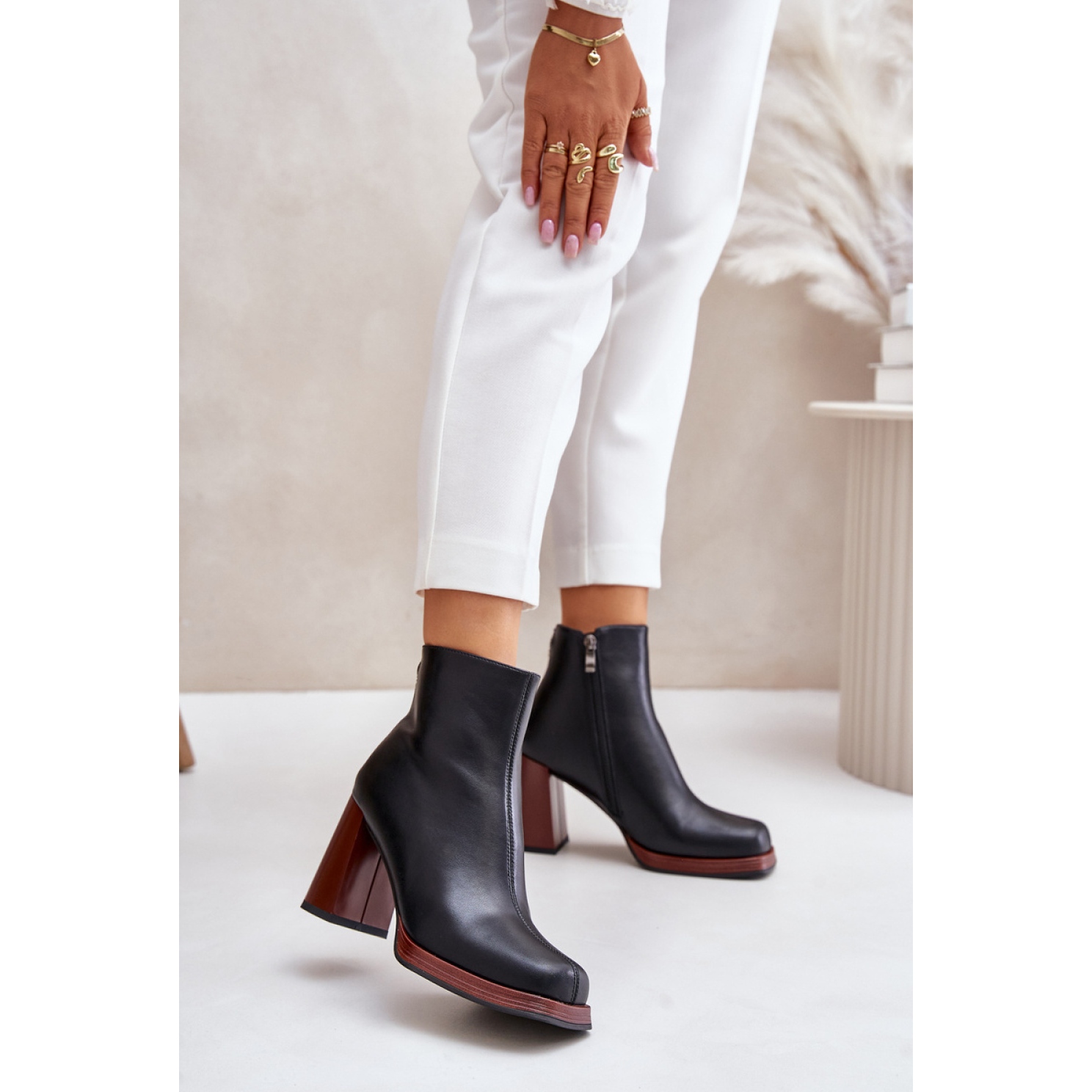 Vysoká horní část 11,5 cm zdůrazňující eleganci obuvi a zaoblené nosy jim dávají kouzlo. Boty jsou připevněny zipem, což usnadňuje oblékání a vzlétání, a další dekorativní detail vzadu jim dává jedinečný charakter.