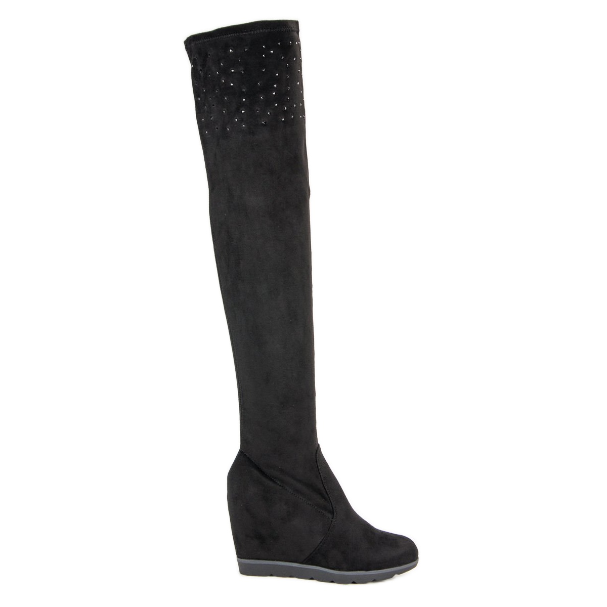 Tyto kozačky nad kolena mají stabilní 9,5 cm klínový podpatek, díky čemuž jsou pohodlné a perfektní pro dlouhé hodiny nošení. Zip navíc usnadňuje obouvání a vyzouvání a jemné kamínky jim dodávají módní charakter. Kulatá špička poskytuje dostatečný prostor pro prsty, což zvyšuje komfort nošení.