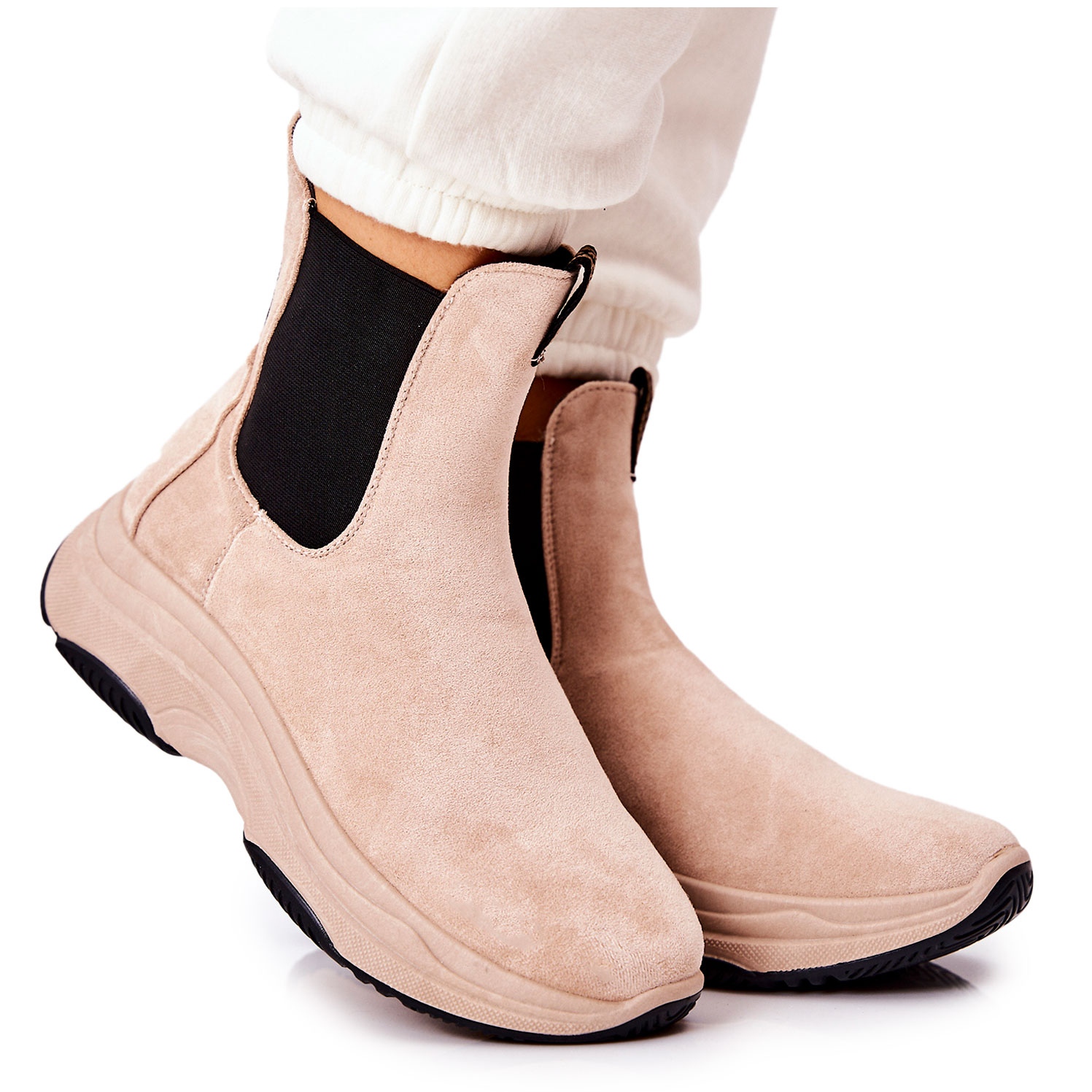 Boty na platformě WS1 z ekologického semiše v béžové barvě jsou perfektní volbou pro podzimní a zimní období pro všechny milovníky módní obuvi. Jsou vyrobeny z měkkého, na dotek příjemného materiálu, zajišťují komfort nošení po celý den. Zajímavým prvkem jsou praktické manžety na svršku, které umožňují jeho přizpůsobení šířce nohy, což zvyšuje komfort používání.