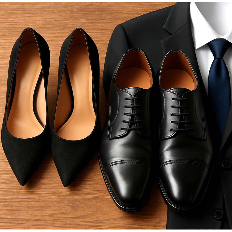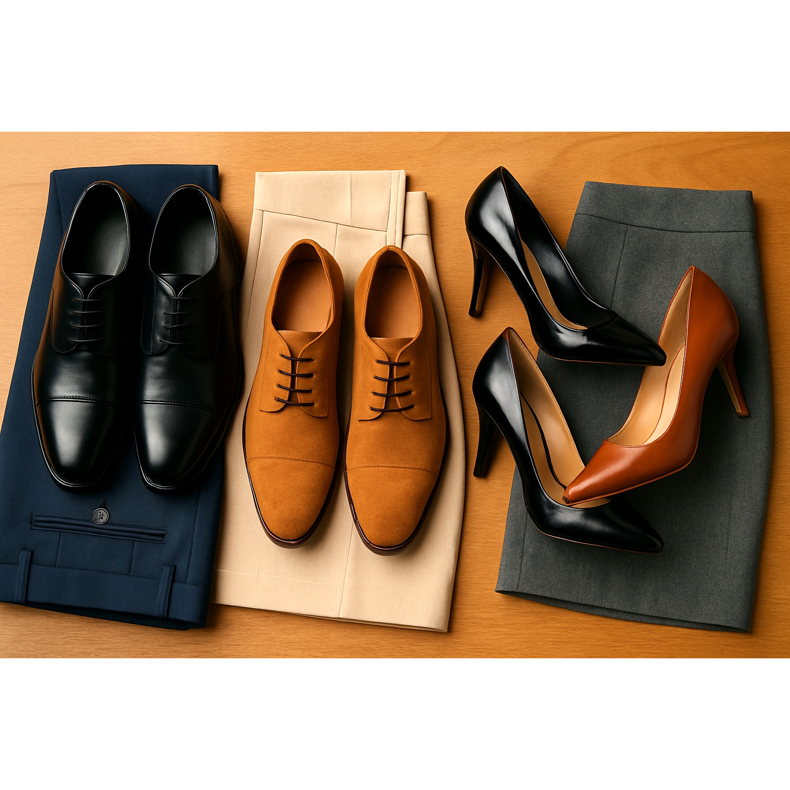 Firemní prostředí vyžaduje konzervativní obuv. Muži by měli nosit černé nebo tmavě hnědé oxfordky nebo derby boty. Ženám budou slušet lodičky na středním podpatku v neutrálních barvách. Vyhněte se extravagantním vzorům, jasným barvám a nadměrnému zdobení. Jednoduchost a klasika jsou klíčem.