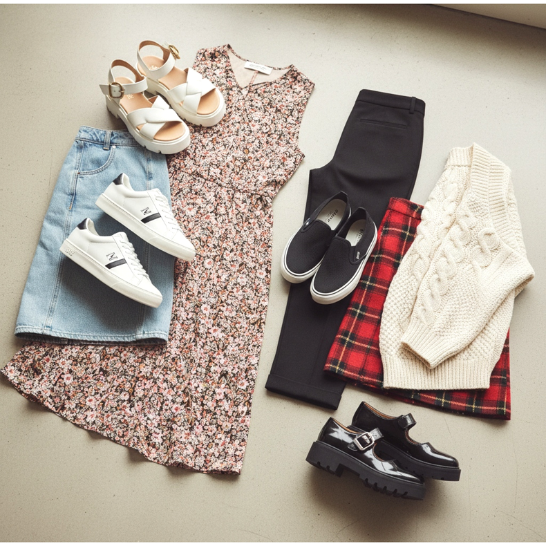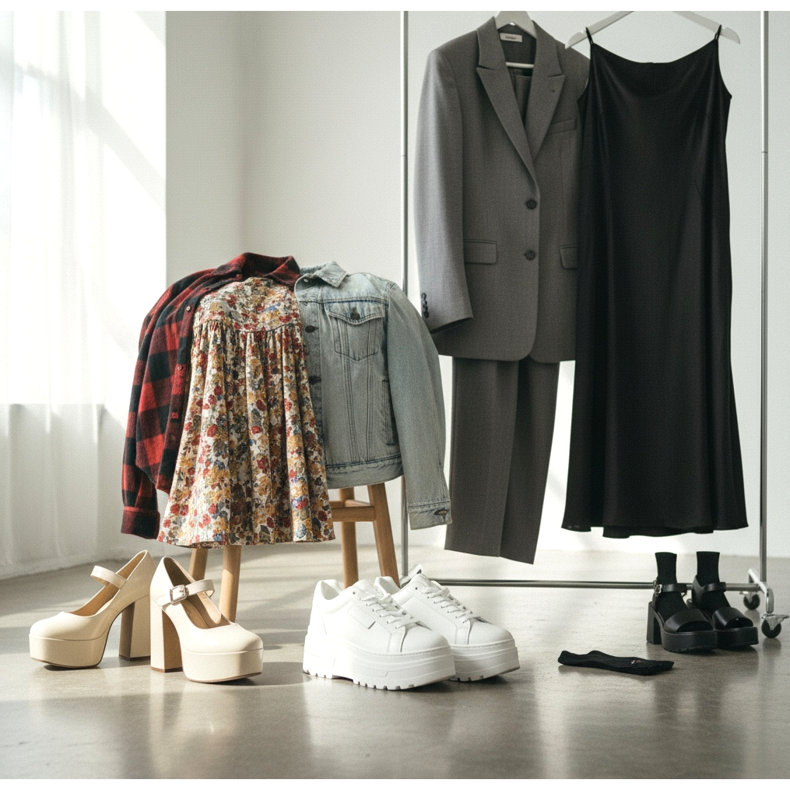 Vintage směsi: Babydoll šaty na platformě Mary Jane s květinovým nebo kostkovaným vzorem. Top s oversized džínovou bundou nebo flanelovou košilí, kterou lze omotat kolem pasu. Efekt je velmi 90. let, ale se soudobou interpretací.