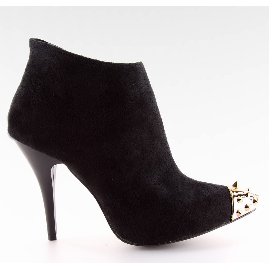 Elegantní černé kotníkové boty na 10 cm vysokém podpatku, vyrobené ze semišové ekologické kůže. Zlaté mandlové prsty a jemné cvočky jim dodávají charakter. Model je podšitý jemným kožíškem, takže je vhodný i do chladnějších dnů. Zip na vnitřní straně usnadňuje oblékání a svlékání.