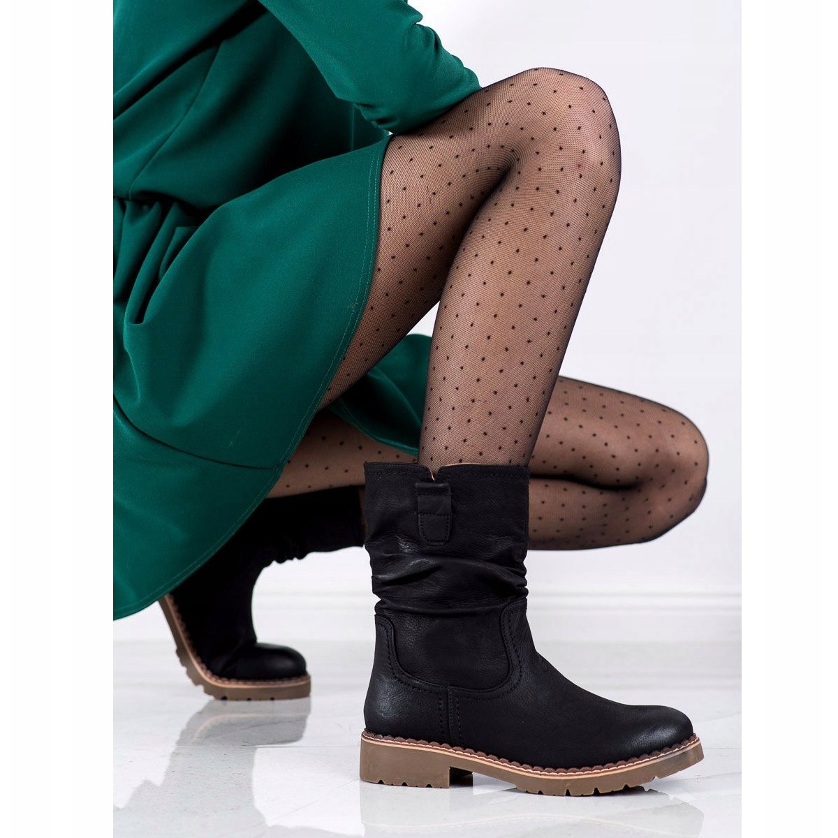 20-21 cm vysoký a 30 cm široký svršek v nařaseném stylu jim dodává jedinečný charakter, zatímco kulatá špička zajišťuje pohodlné nošení. Boty mají zip, díky kterému se snadno nazouvají i zouvají. Plochý 3,5 cm vysoký podpatek z nich dělá ideální řešení pro každodenní nošení, aniž by utrpěly módní vzhled.