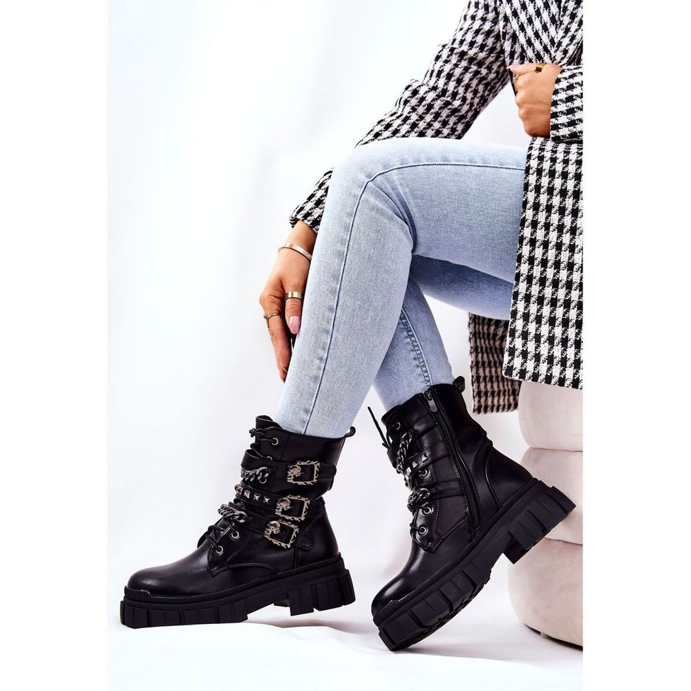 Díky šněrování a zipu na boku je obouvání velmi snadné. Dekorativní prvky jako spony s motivem lebky, opasky s řetízky a cvočky upoutají pozornost a zdůrazní individuální styl. Horní výška 17 cm a plochý podpatek 5,5 cm dělají boty pohodlné a stabilní, ideální na dlouhé dny.