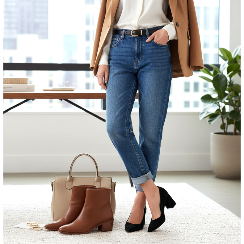 Vyhněte se však sportovní obuvi, která může v kanceláři působit neprofesionálně. Také příliš masivní boty mohou přebít elegantní styling s boyfriend kalhotami.