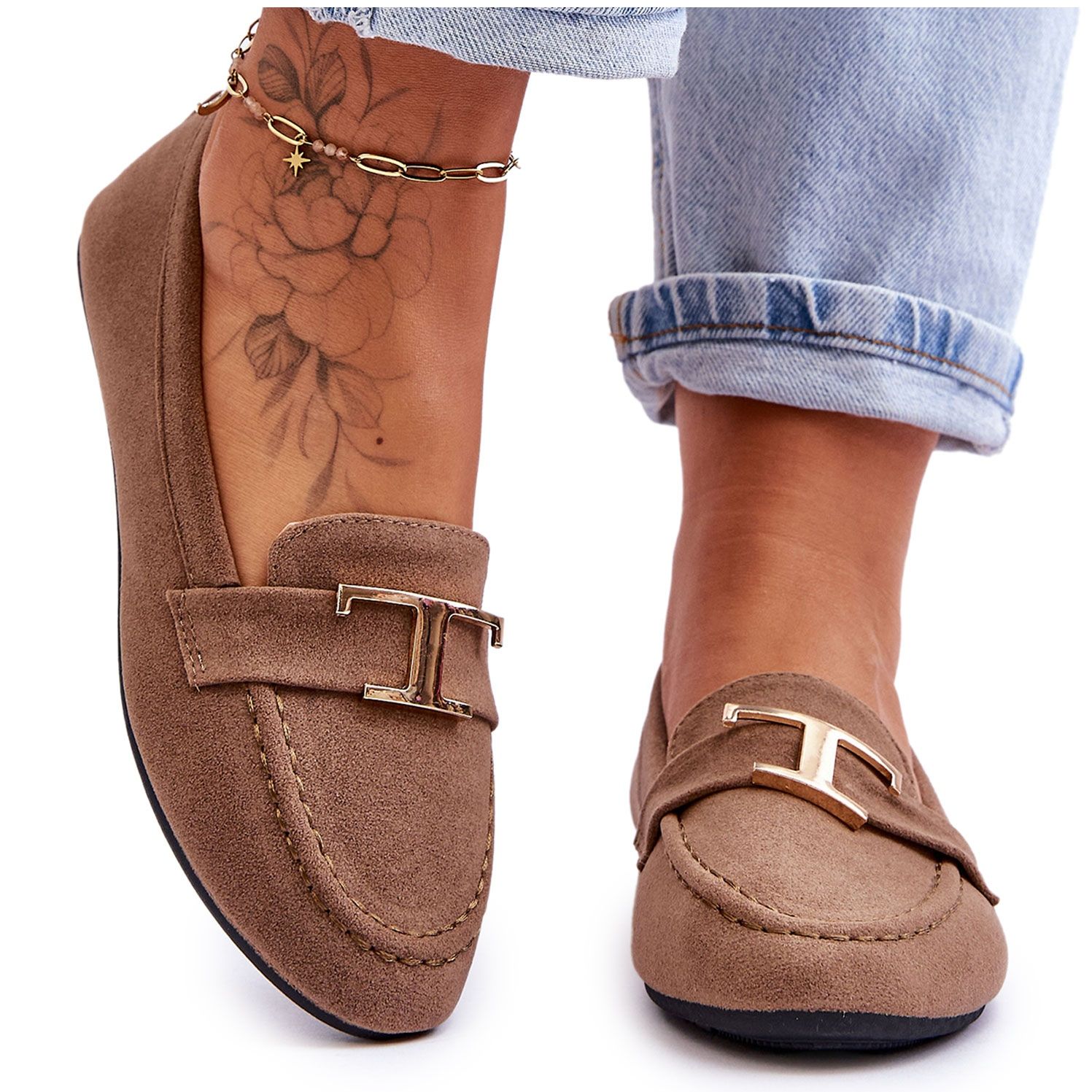 Elegantní, nadčasová Carly Mokasína jsou nutností v šatníku každé ženy. Vyrobeno z semišové ekologické kůže v neutrální béžové odstín, s jemnou zlatou dekorací a kamínky, kombinují pohodlí denní boty s elegantní povrchovou úpravou ideálním pro mnoho stylů.