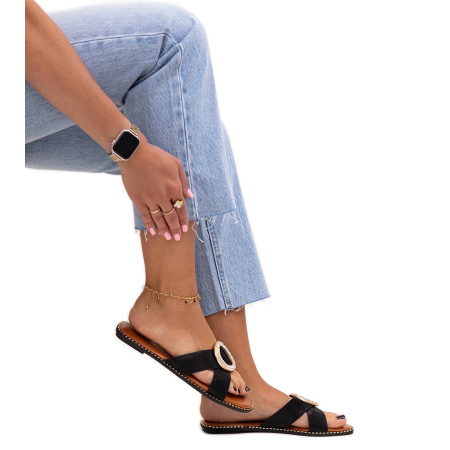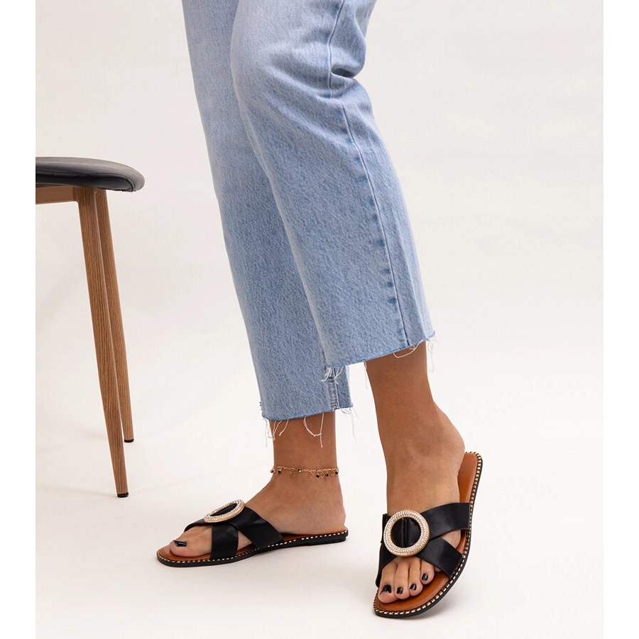 Tyto žabky jsou vyrobeny z vysoce kvalitní ekologické kůže a jsou charakterizovány flexibilní gumovou podrážkou, která poskytuje pohodlí při chůzi. Kulatý nos a moderní design je činí nejen praktickými, ale také módními. Další výhodou je velkolepá přezka zdobená zirkony, která jim dává jedinečný charakter.