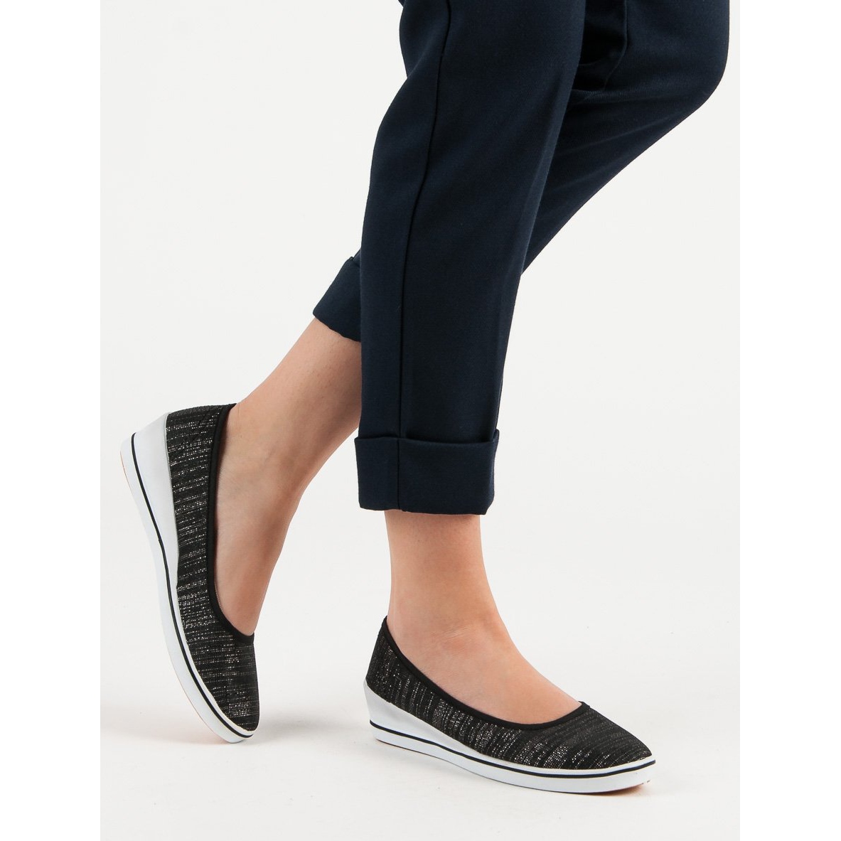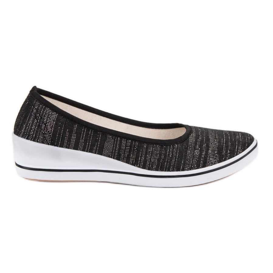 Balerínky Black Wedge od značky Comer jsou perfektní volbou pro ženy, které si cení pohodlí a elegance v každodenním životě. Tyto klasické slip-on boty mají kulatou špičku a měkkou vyztuženou sponu, která zajišťuje pohodlí i při dlouhodobém nošení. Balerínky jsou vyrobeny z pletené tkaniny příjemné na dotek a lehce se třpytí šedou barvou a dodávají jim jemné kouzlo.