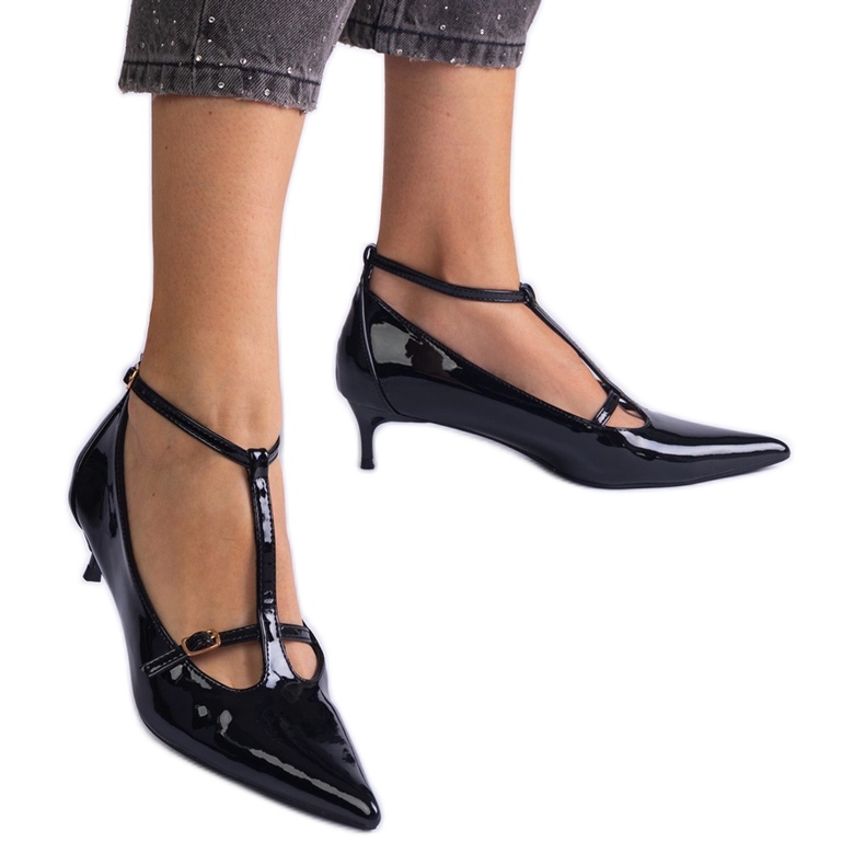 Černá čerpadla vázaná na nízké hromadě s sponami jsou perfektní volbou pro každou ženu, která chce kombinovat eleganci s pohodlím. Model 86QG od renomované značky Další značka je vynikajícím doplňkem každodenních i formálnějších stylizací.