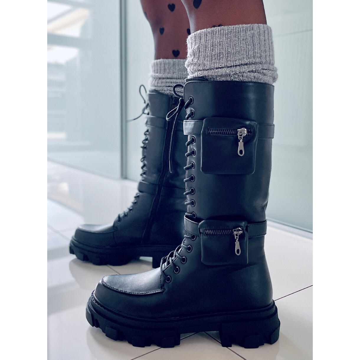 Pro ženy, které mají rádi expresivní akcenty v každodenních stylizacích. Černé boty ASOT kombinují vojenský charakter s praktickými řešeními - masivní, 5 cm platforma přidává krok jistoty a pouzdro na horní části zdůrazňují původní design užitečnosti.