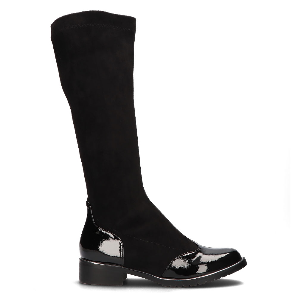 Tyto černé boty jsou ideální pro každodenní styling. Po kolena a kulatý nos vypadají klasicky a univerzálně. Díky nazouvacímu zapínání je jejich oblékání a svlékání rychlé a pohodlné. Plastová podrážka zajišťuje dostatečnou přilnavost a odolnost a výška platformy 1 cm dodává subtilní komfort.