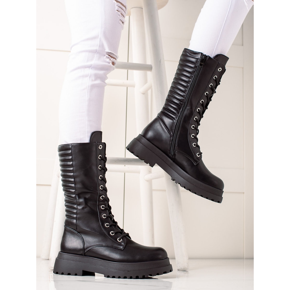 Boty jsou vyrobeny z vysoce kvalitních materiálů, mají měkkou uzavřenou patu a izolaci, která zahřeje i v chladnějších dnech. Jejich horní část do poloviny lýtek a kulatá špička dodávají charakter, zatímco 3,5 cm vysoká platforma a 5 cm plochý podpatek zaručují pohodlí při používání po mnoho hodin.